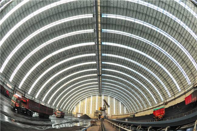 堆场料场封闭式主体结构为新型的钢舞钢网架结构,维修结构为舞钢钢结构舞钢不锈钢板和纤维增强塑料灯具,其外形以舞钢网架式和平板为主,连接柱舞钢施工自由,设置喷雾自动喷水系统,从而可以实现棚内所有物料的覆盖,减少物料在运输过程中的损耗,起到防尘的作用,减少工厂关闭后的二氧化硫排放量,50mg/m3颗粒排放量小于10mg/m3,非常适合低能耗。低闭库自动感应反应对库存轮胎进行清洁,确保轮胎不受道路污染;封闭的储存区可从源头控制粉尘污染,控制无序排放。